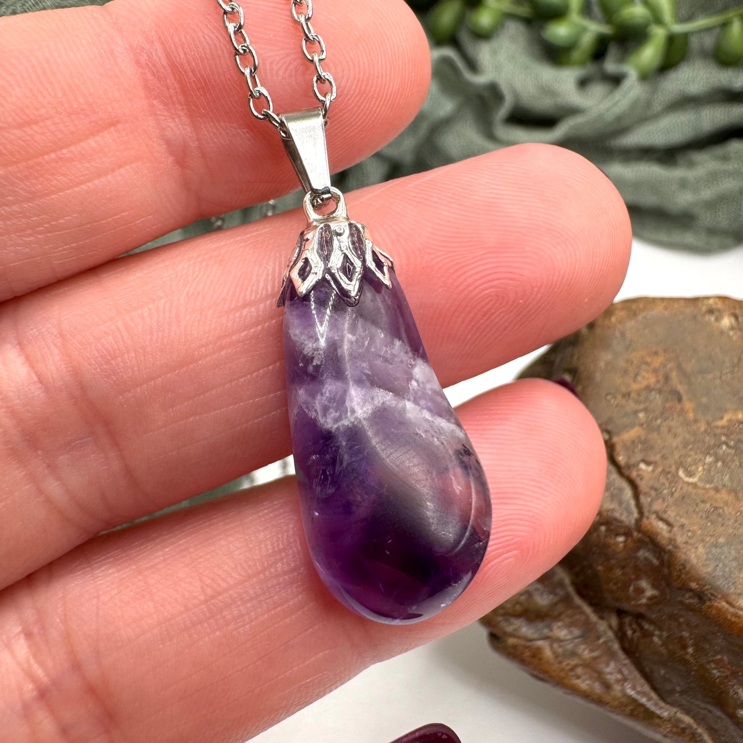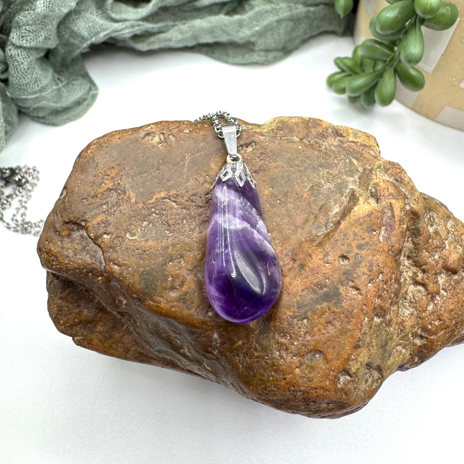 Carry a piece of the earth with you with this chevron amethyst necklace. The gorgeous gemstone comes on a stainless steel chain with a lobster clasp, which can be adjusted to 18 or 20 inches. Stainless steel is hypoallergenic, highly durable, and it won't tarnish, making it a wonderful choice for everyday wear.