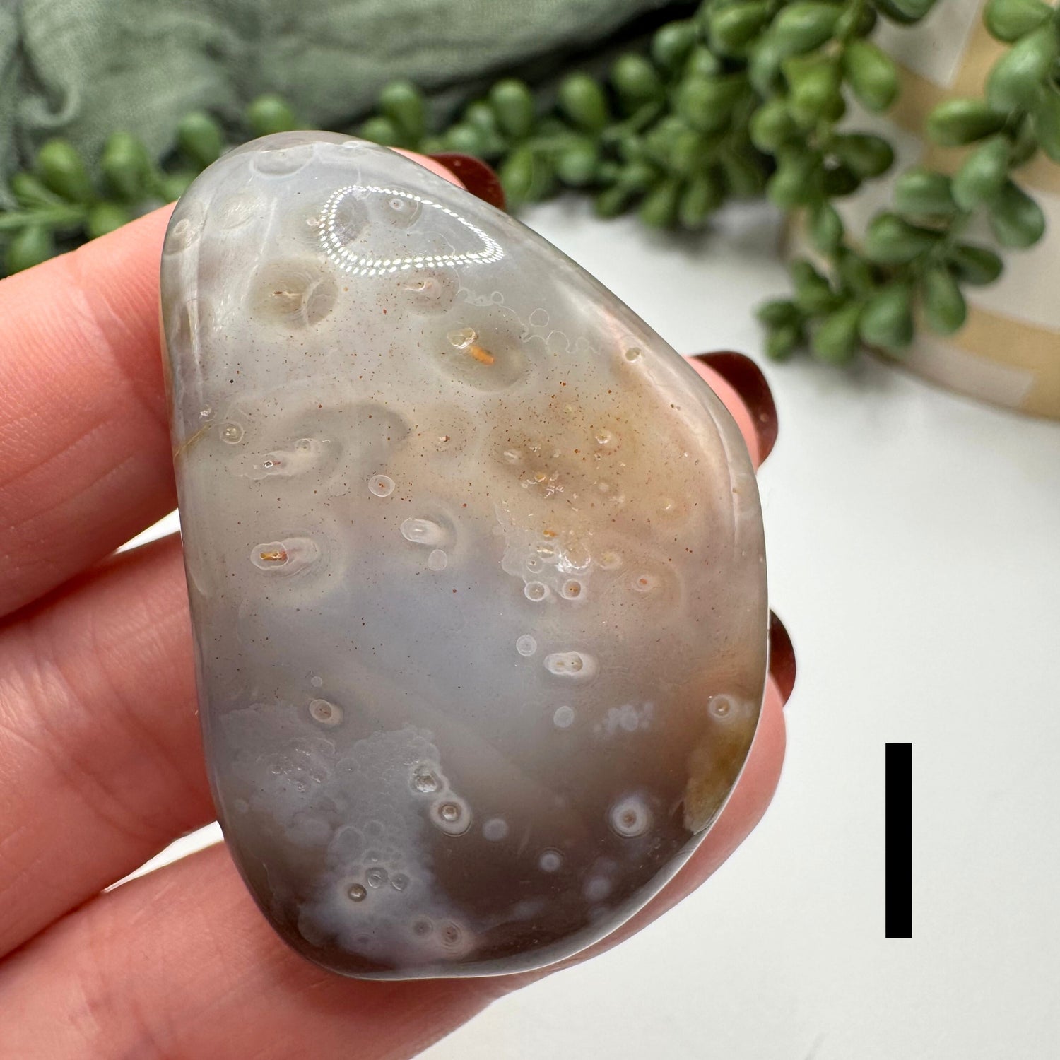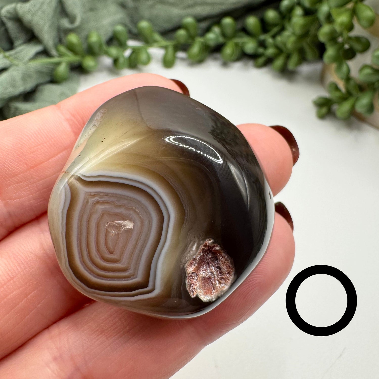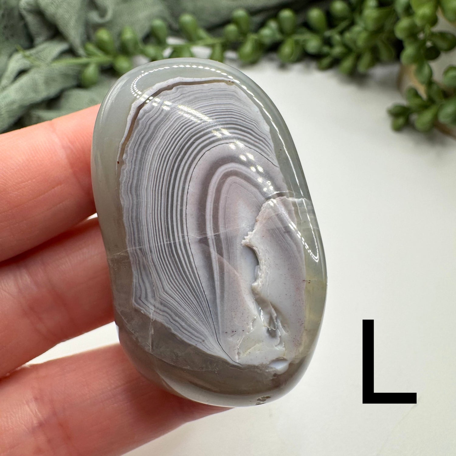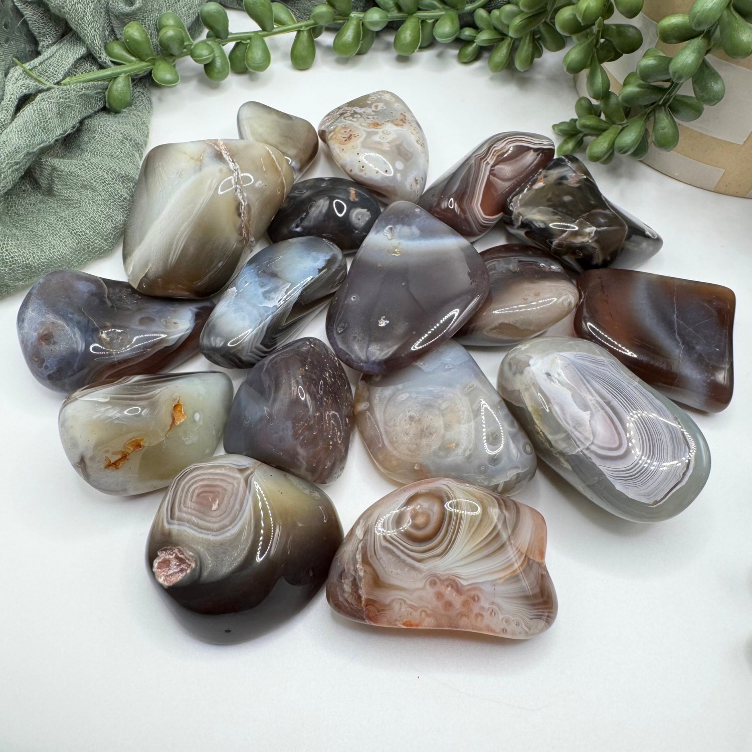 Choose your favorite Botswana agate tumble! Botswana agate is a variety of chalcedony with gorgeous gray, pink, and brown banding. These tumbles range from 1-2 inches in length.