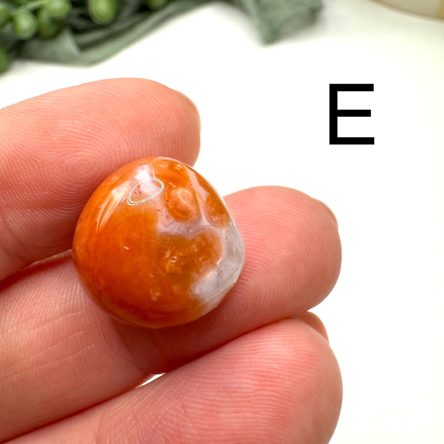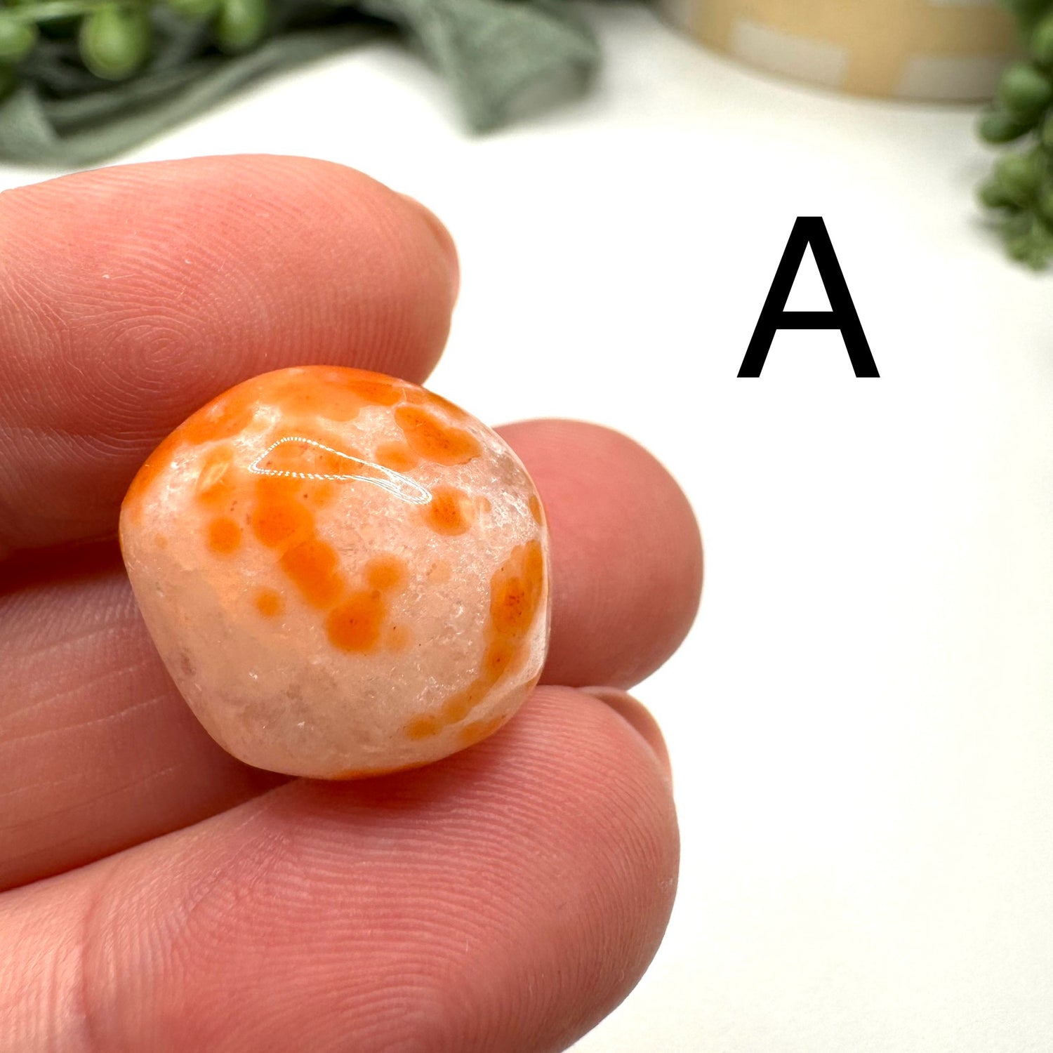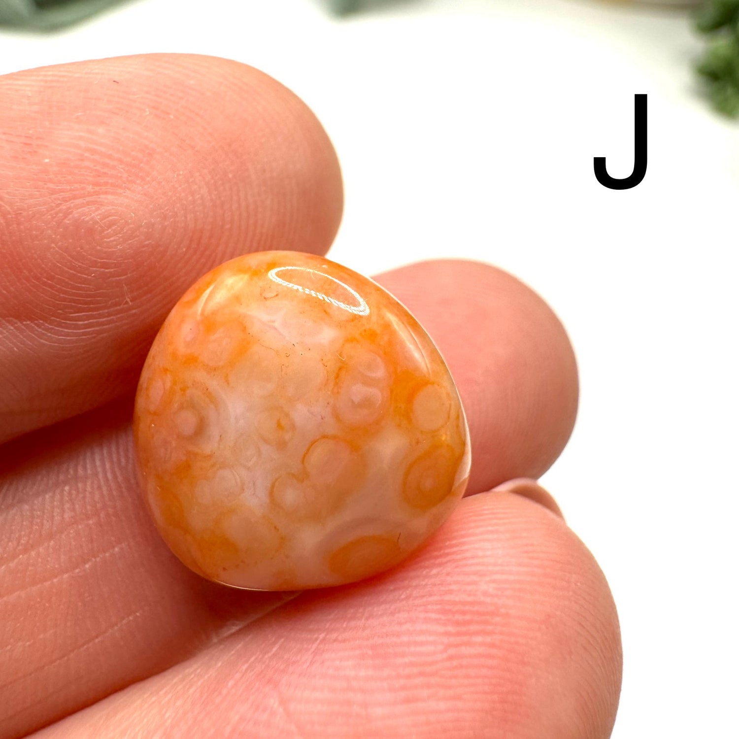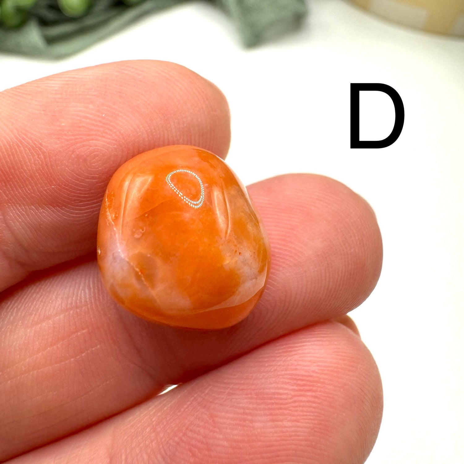 Choose your favorite carnelian tumble! These tumbles are gorgeous shades of vibrant orange with white speckles. They range from .5-1 inch in length.