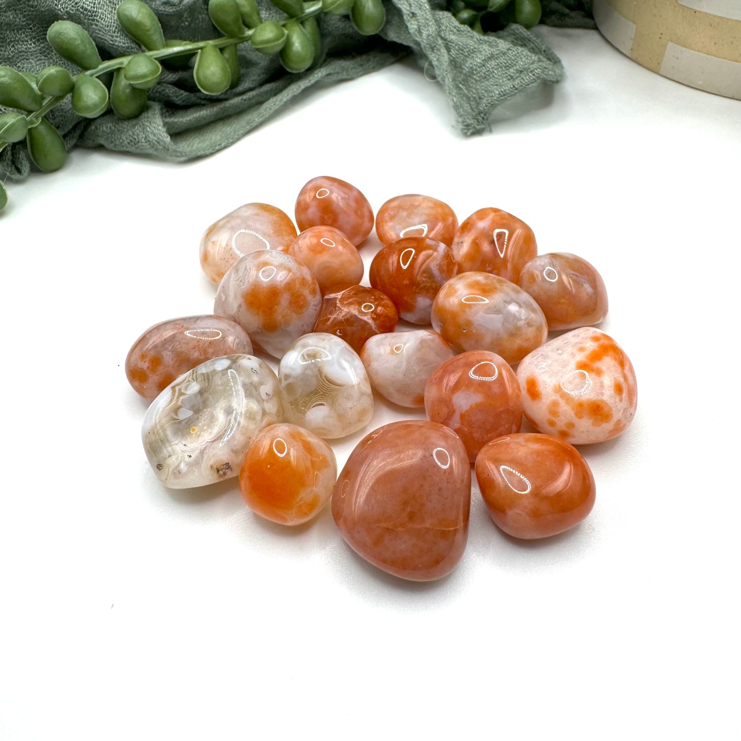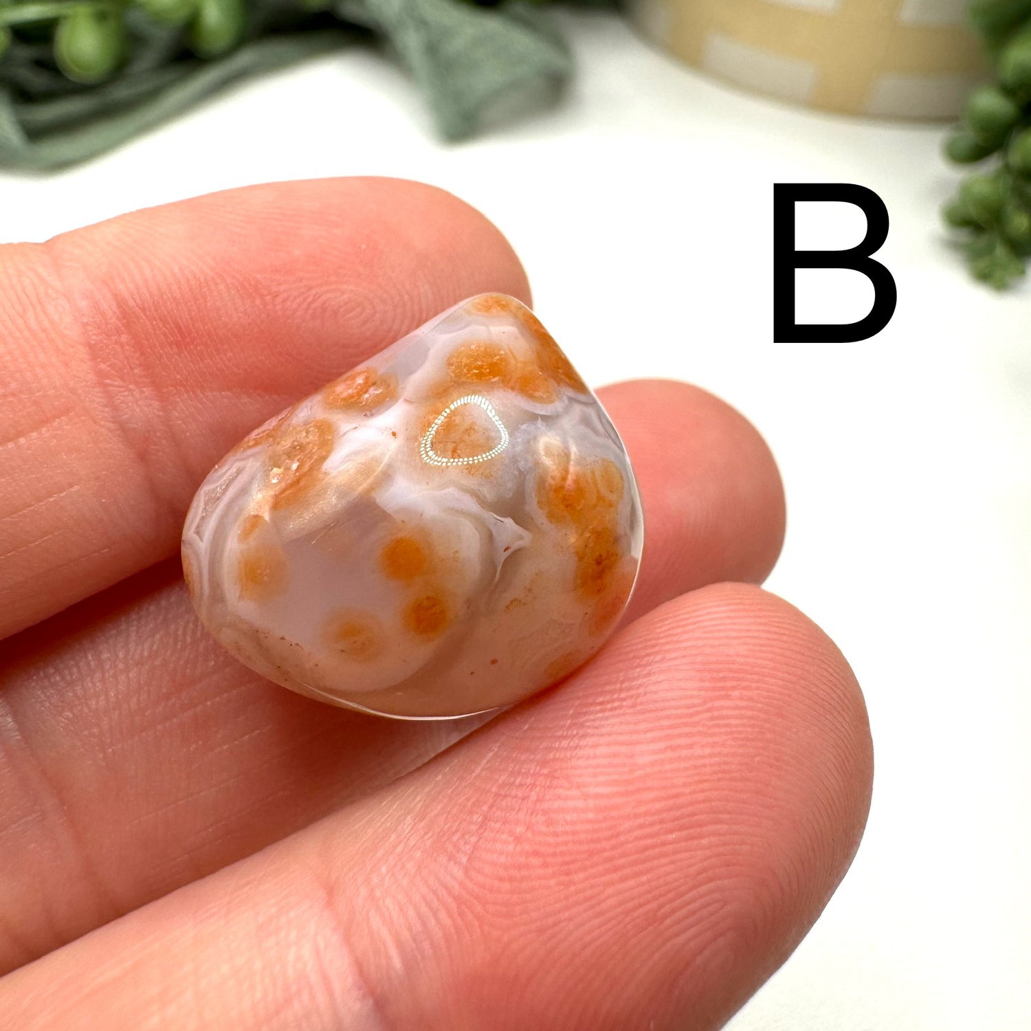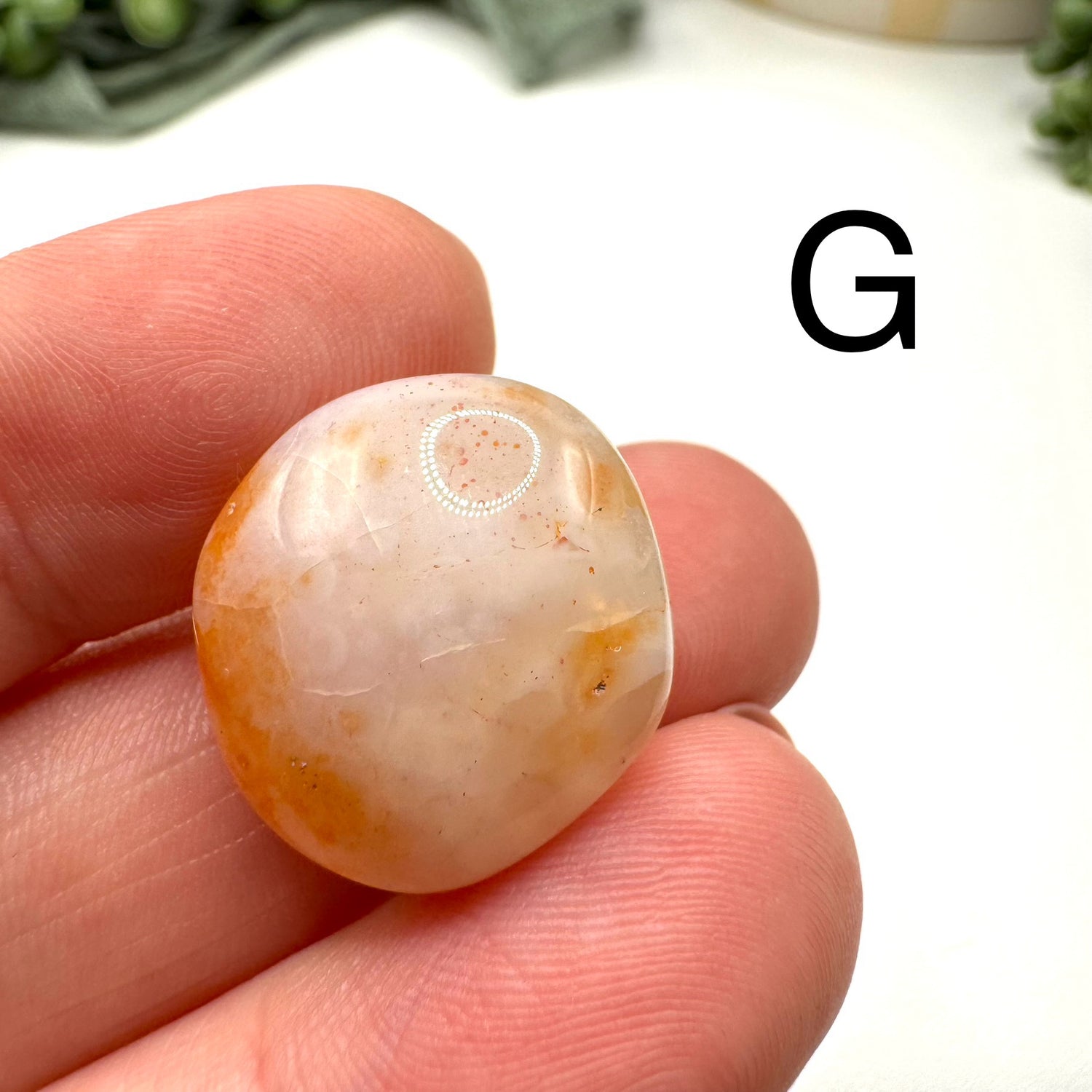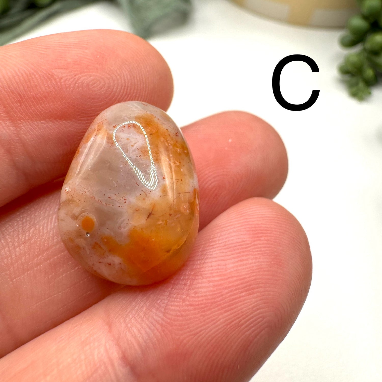 Choose your favorite carnelian tumble! These tumbles are gorgeous shades of vibrant orange with white speckles. They range from .5-1 inch in length.