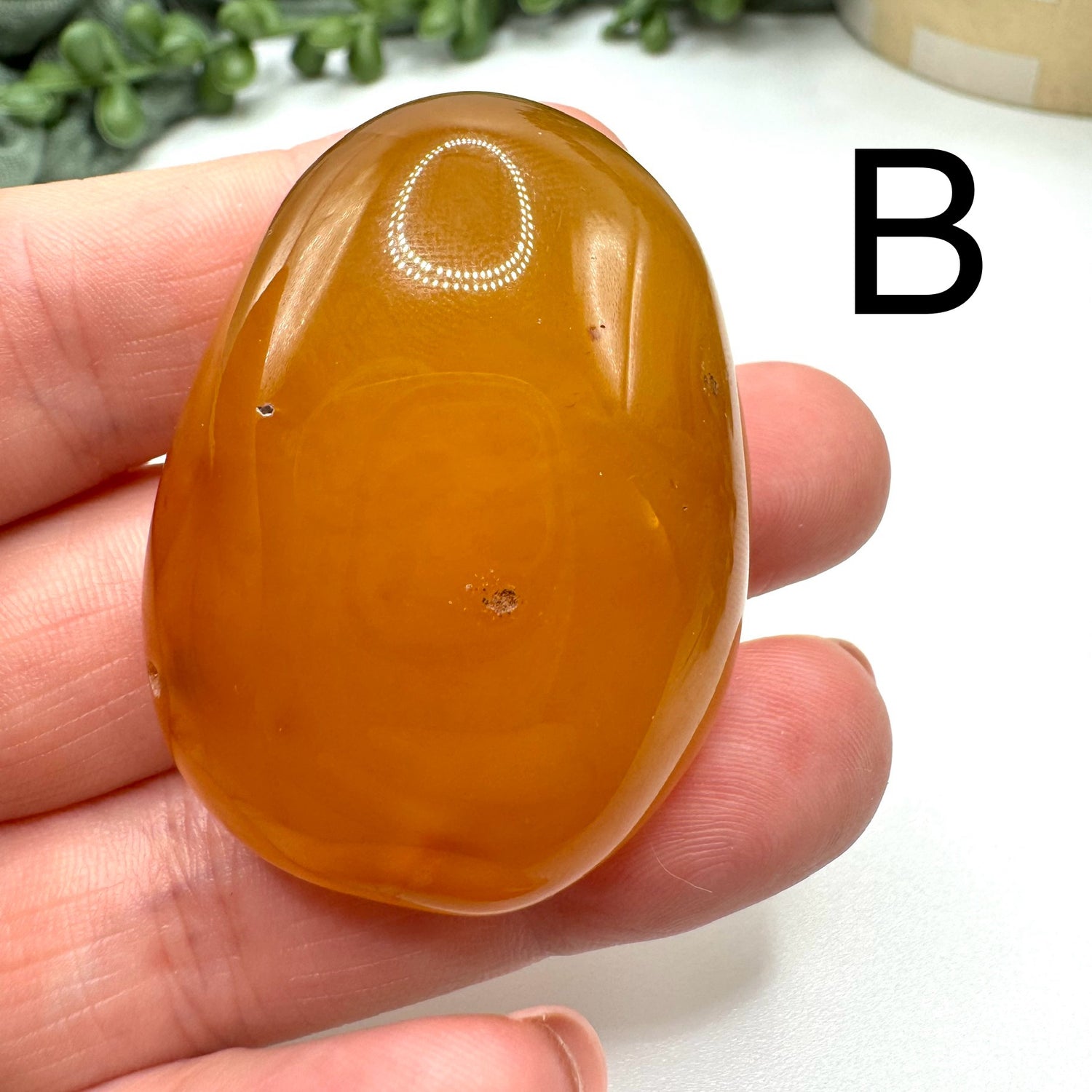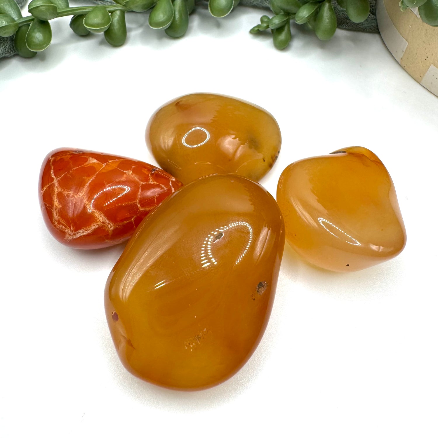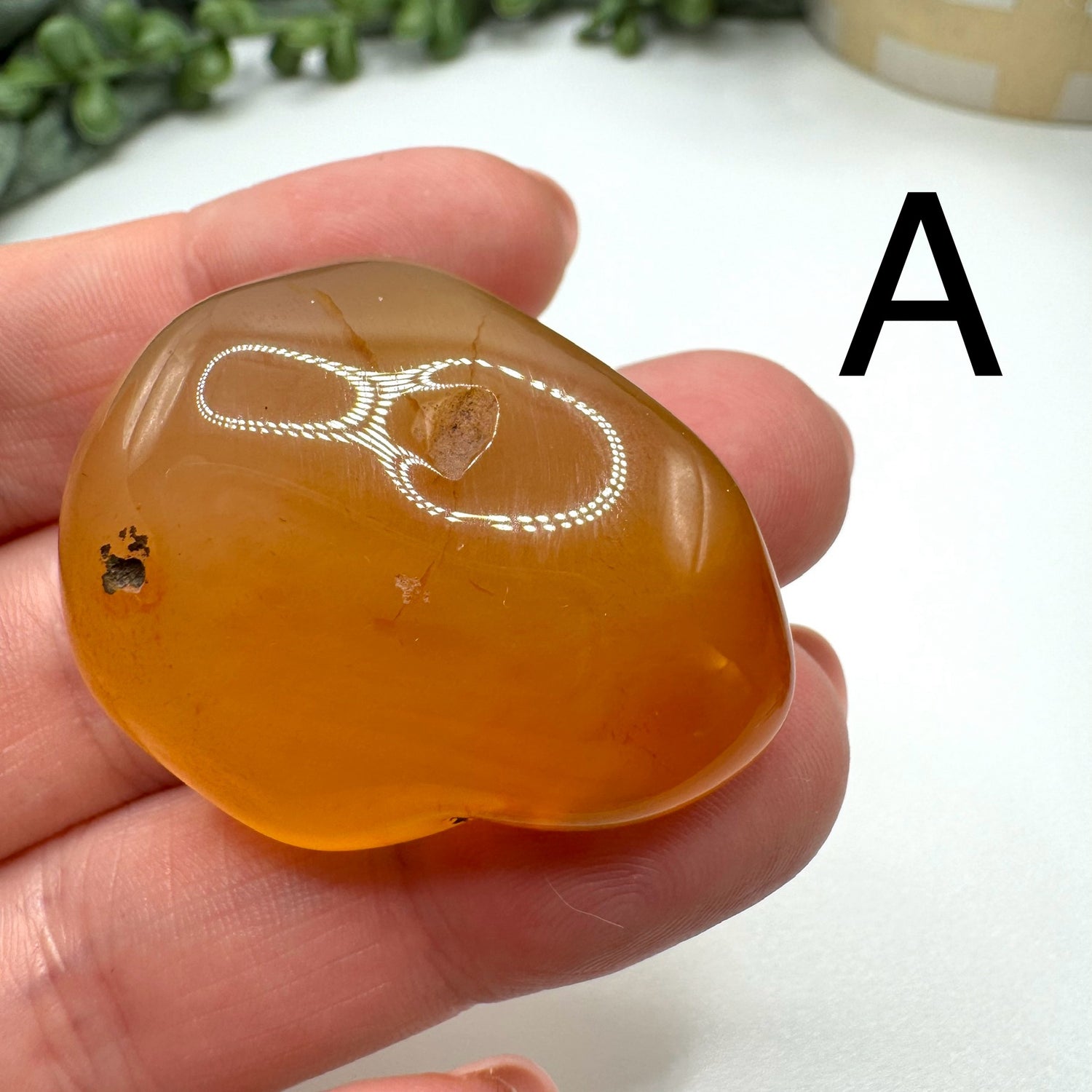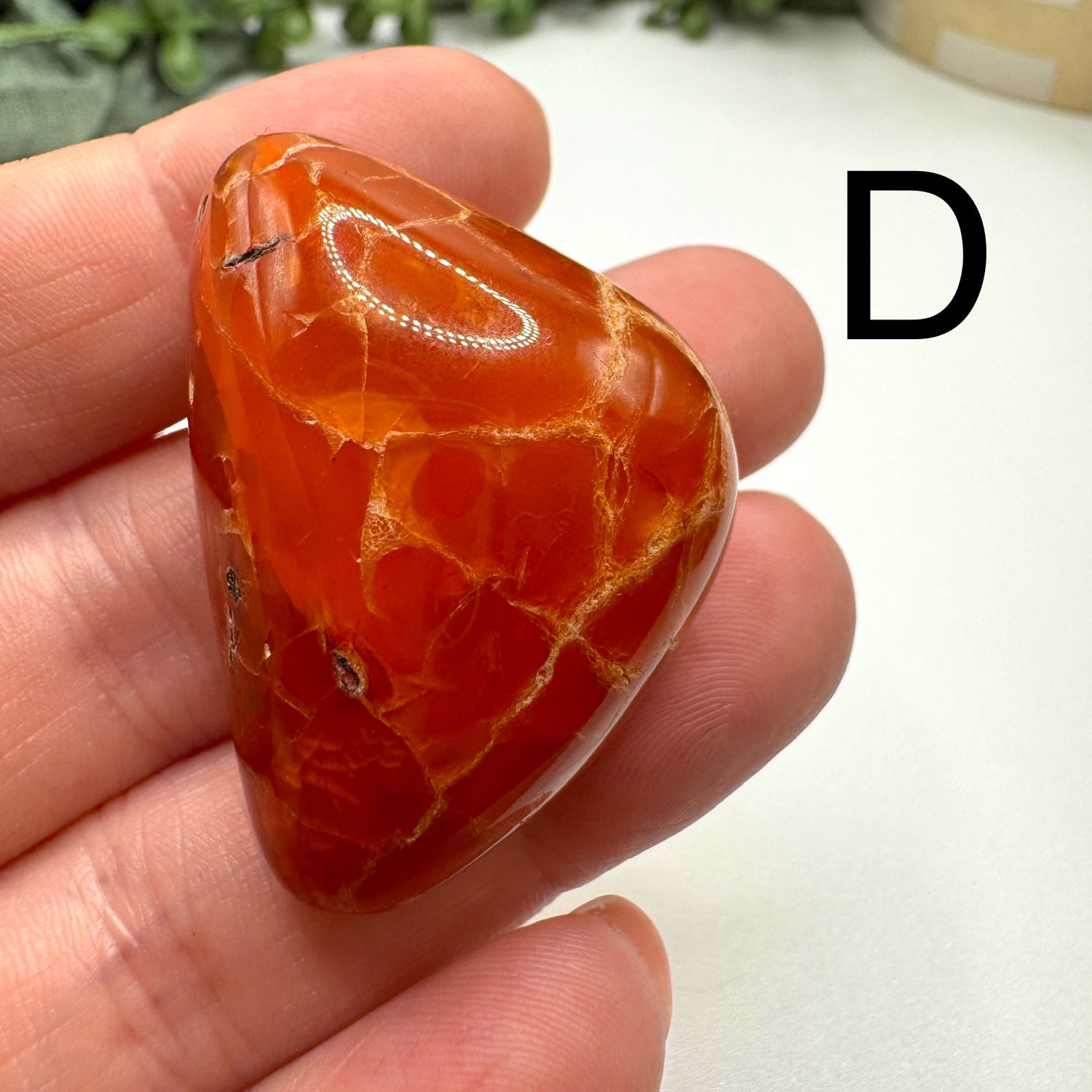 Choose your favorite carnelian tumble! These are the carnelians that tumbled with my emerald batch recently. A, B, and C look very much like shiny potatoes. They range from 1.5-2.5 inches in length.