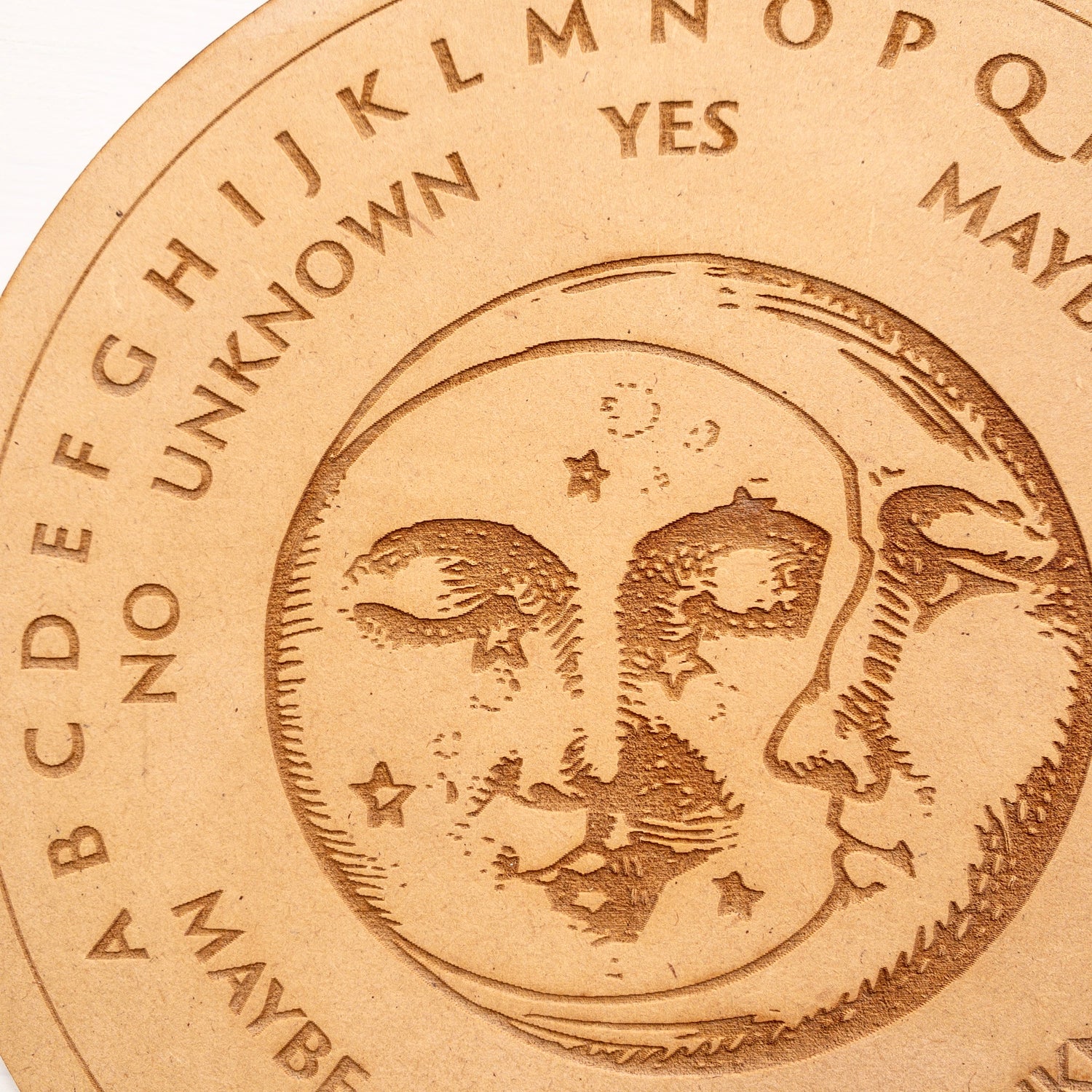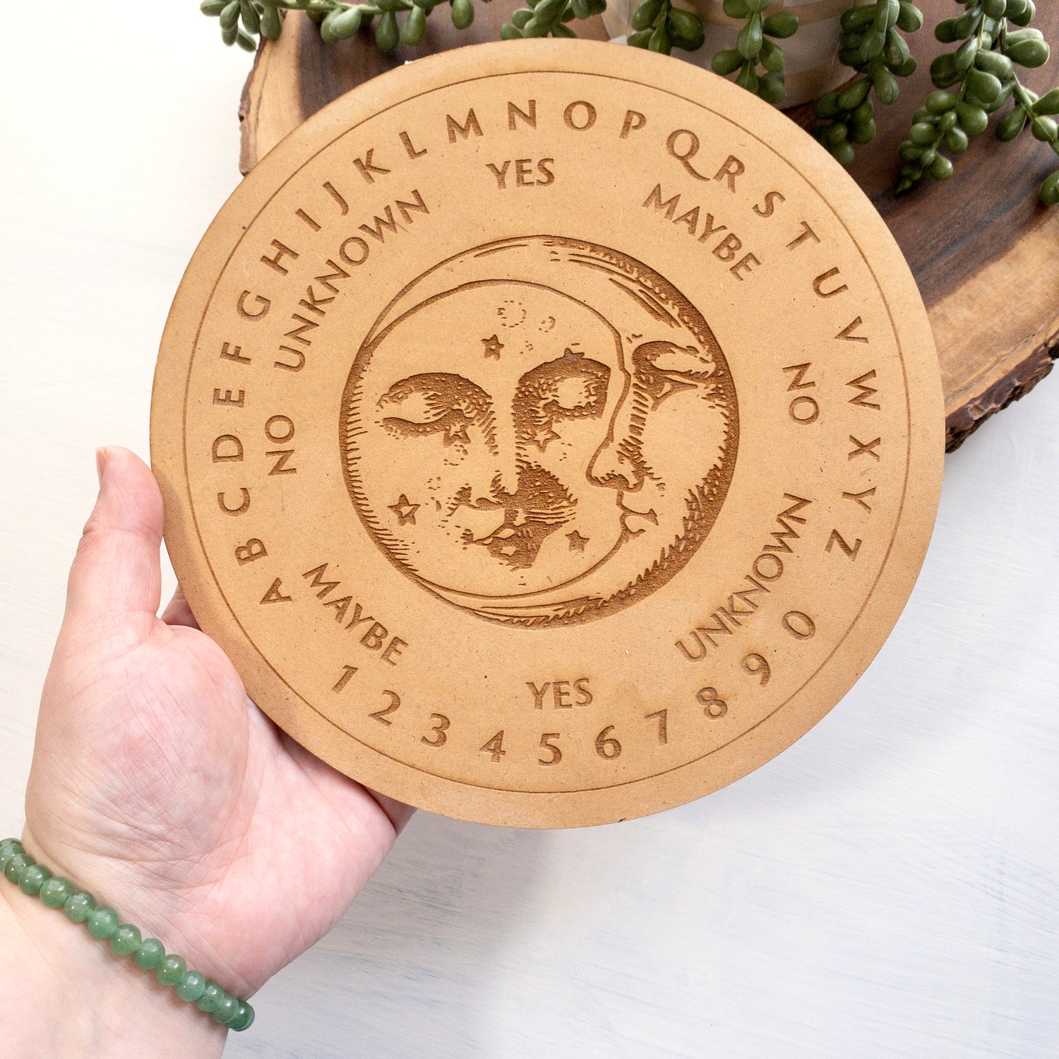 This wooden pendulum board is intricately engraved with the sun and the moon, the alphabet, numbers, and common answer phrases for pendulum work and other spiritual uses. It measures approximately 8" wide and 3mm thick. A pendulum board makes interpreting the pendulum's sway easy, whether you're new to divination or an established witch.