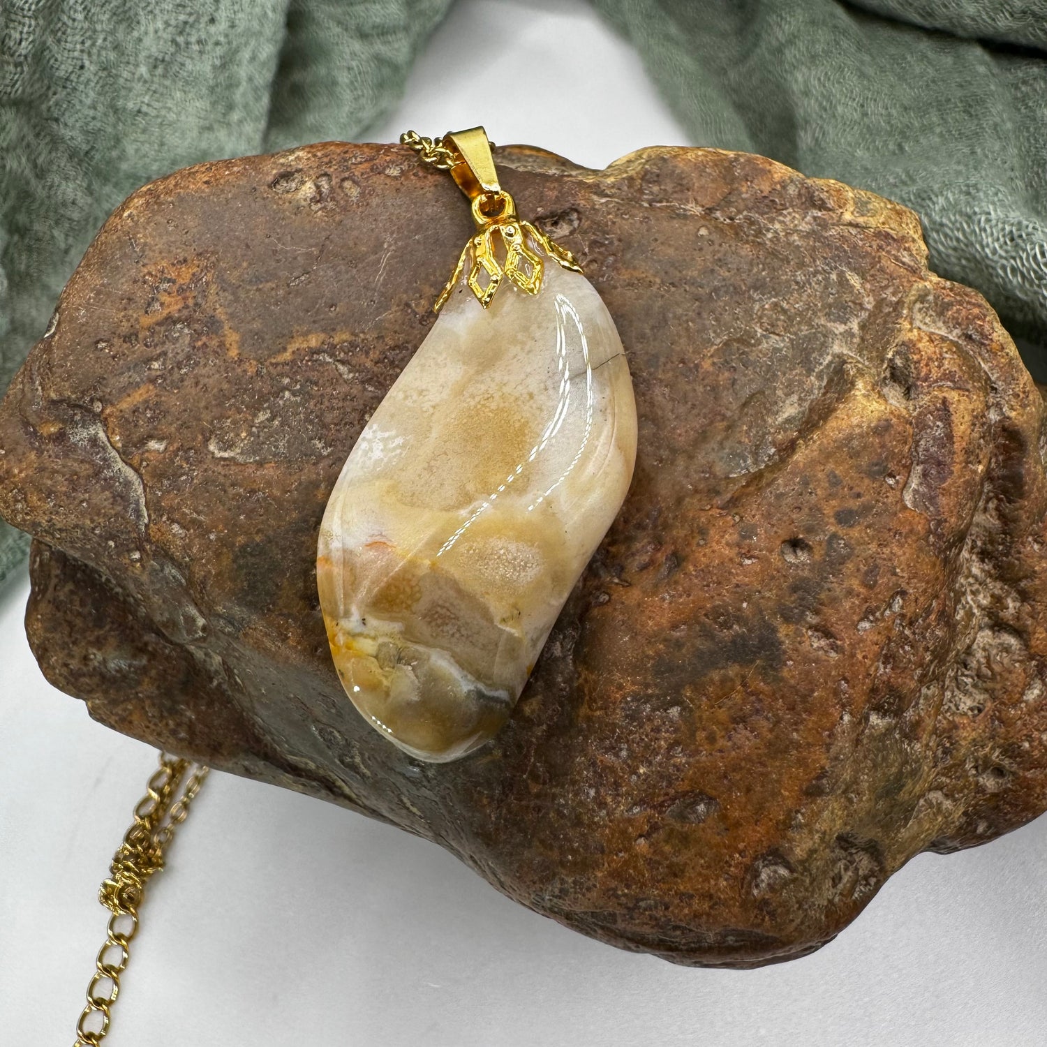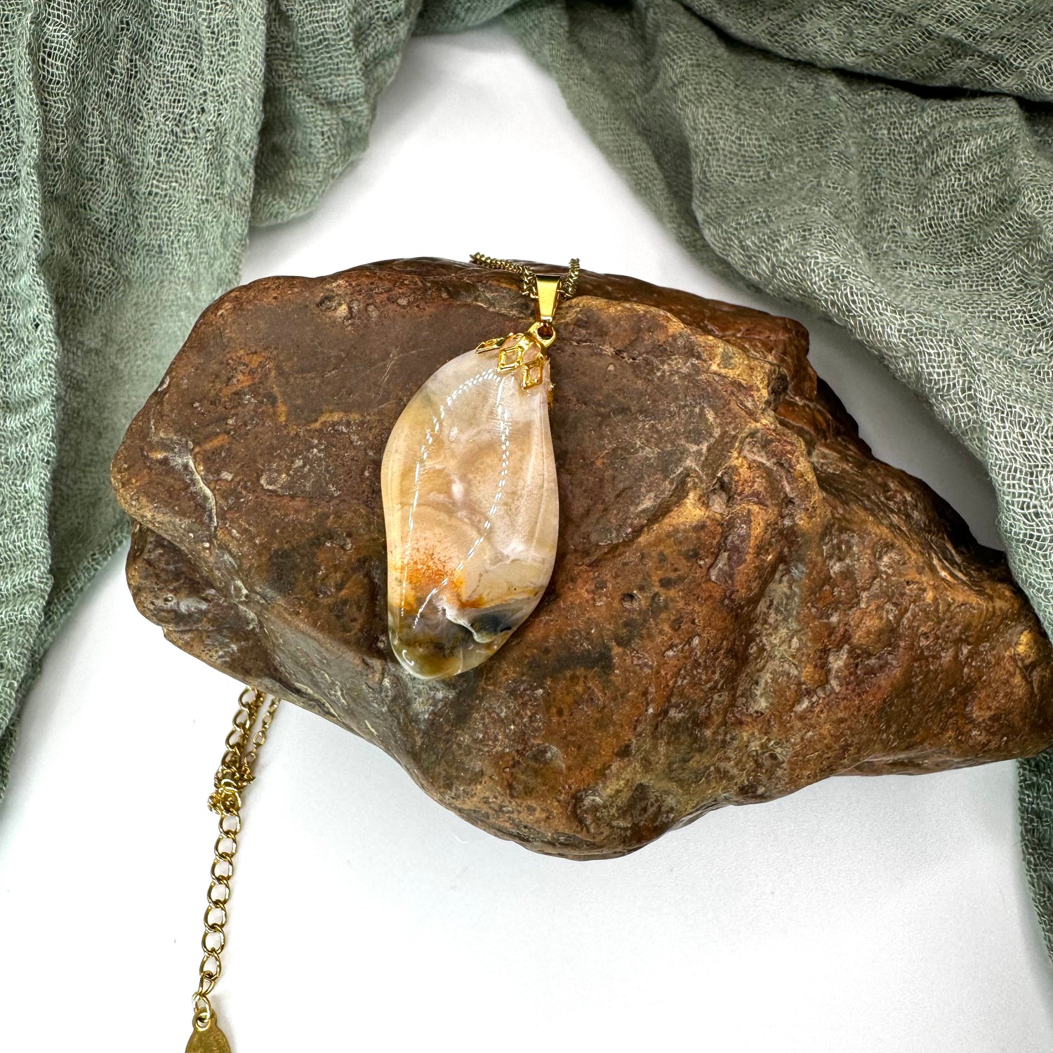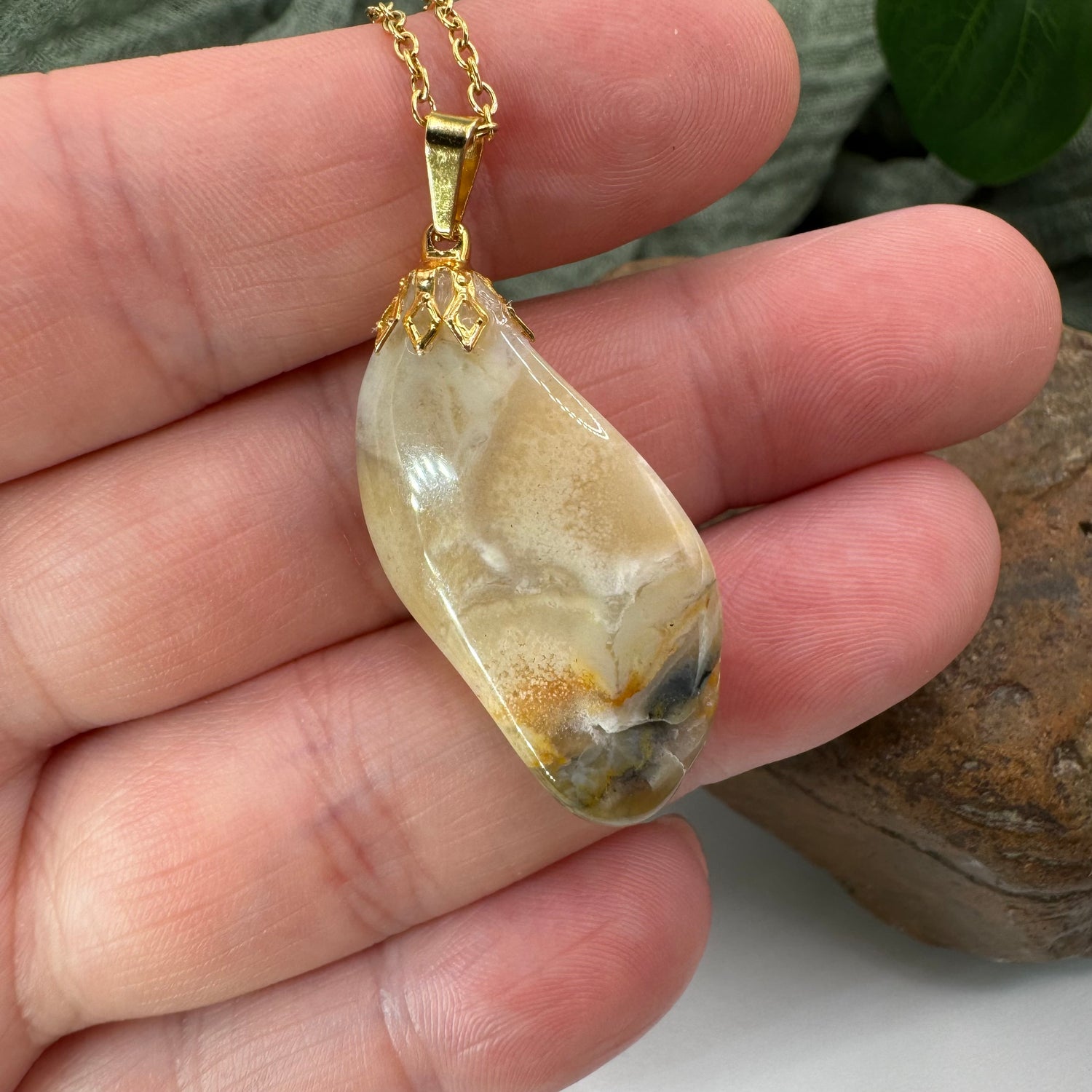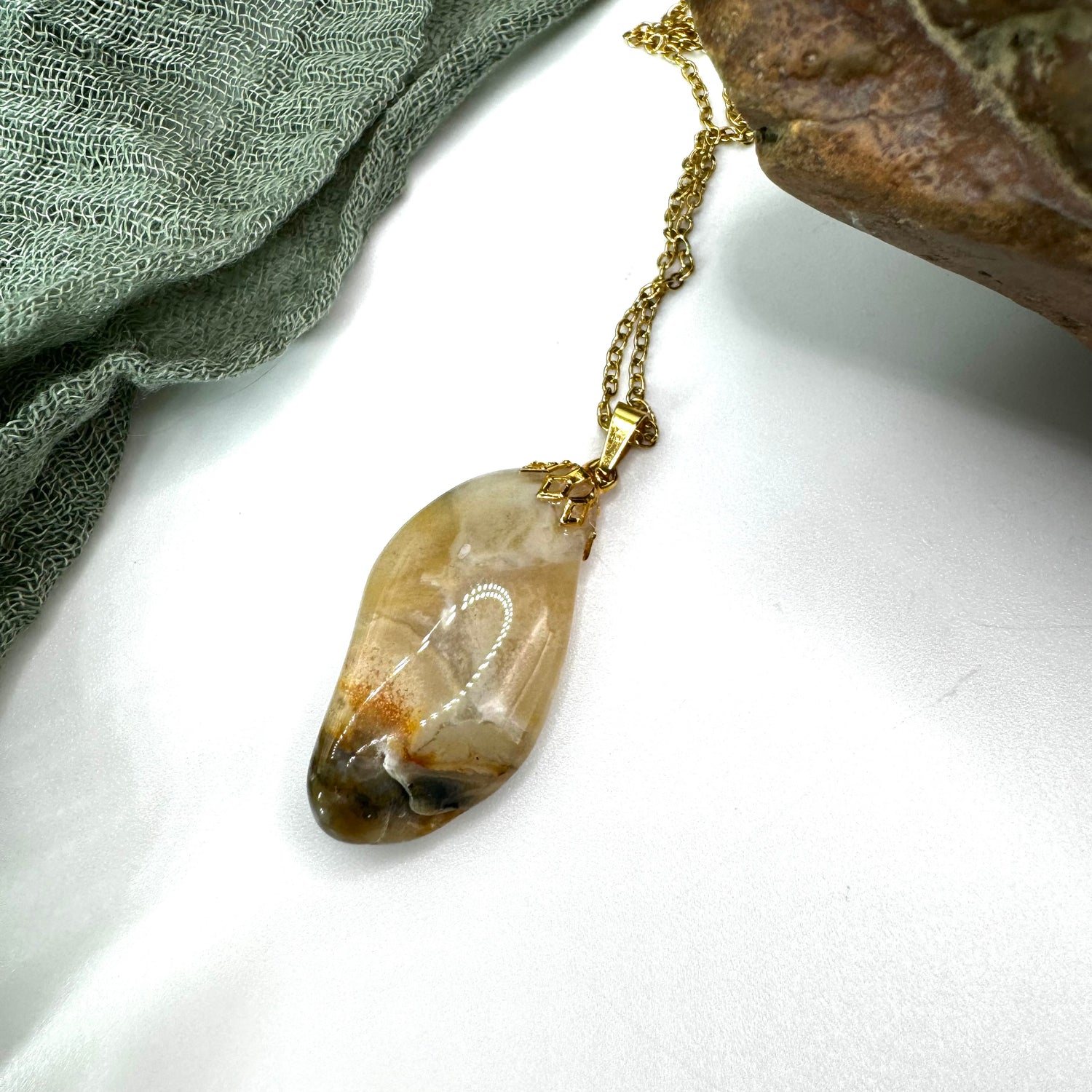 Carry a piece of the earth with you with this prairie agate necklace. Prairie agates are known for their varied patterns and distinctive color palettes: warm browns, muted yellows, soft whites, and the occasional tinge of red. The stone on this necklace was found in the plains of South Dakota and tumbled to a beautiful polish before being set on the gold-finished stainless steel chain. The length can be adjusted from 18 to 20 inches. Stainless steel is hypoallergenic, highly durable, and it won't tarnish, making it a wonderful choice for everyday wear.