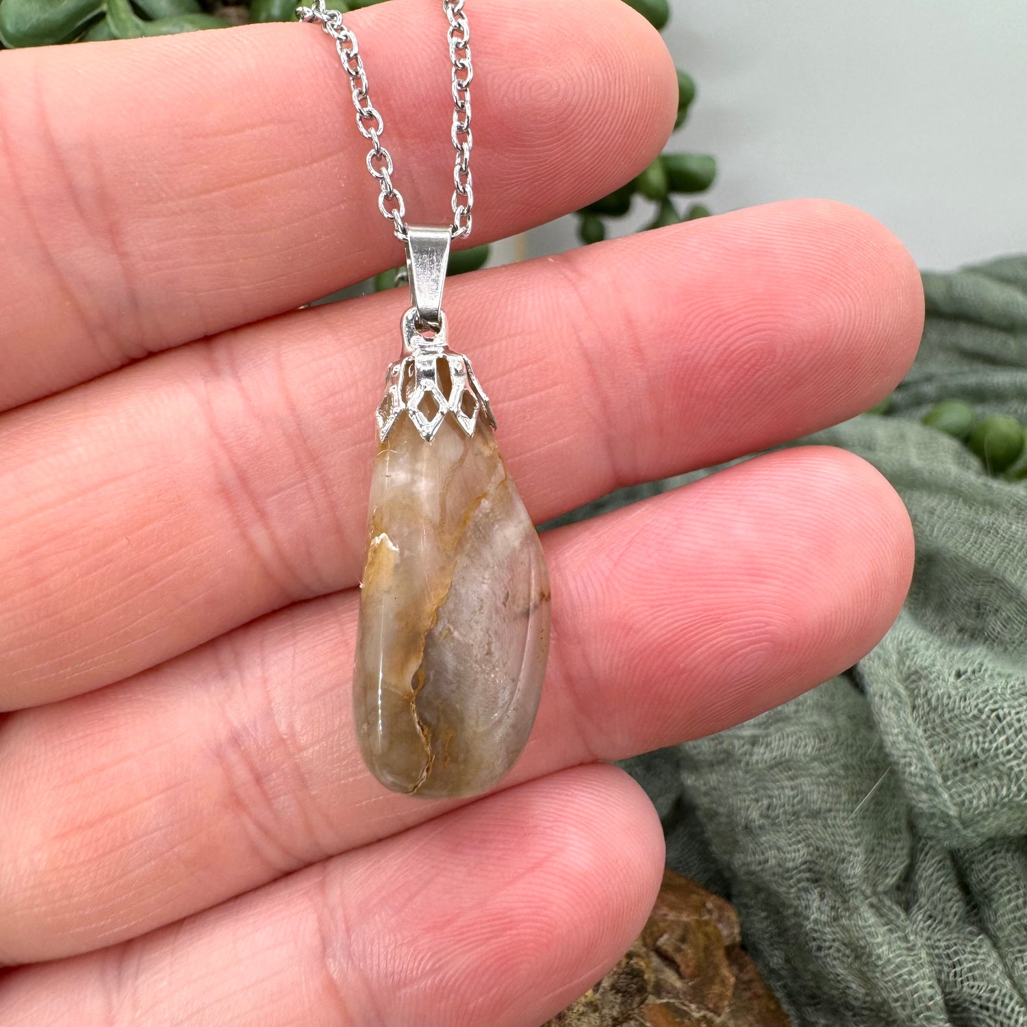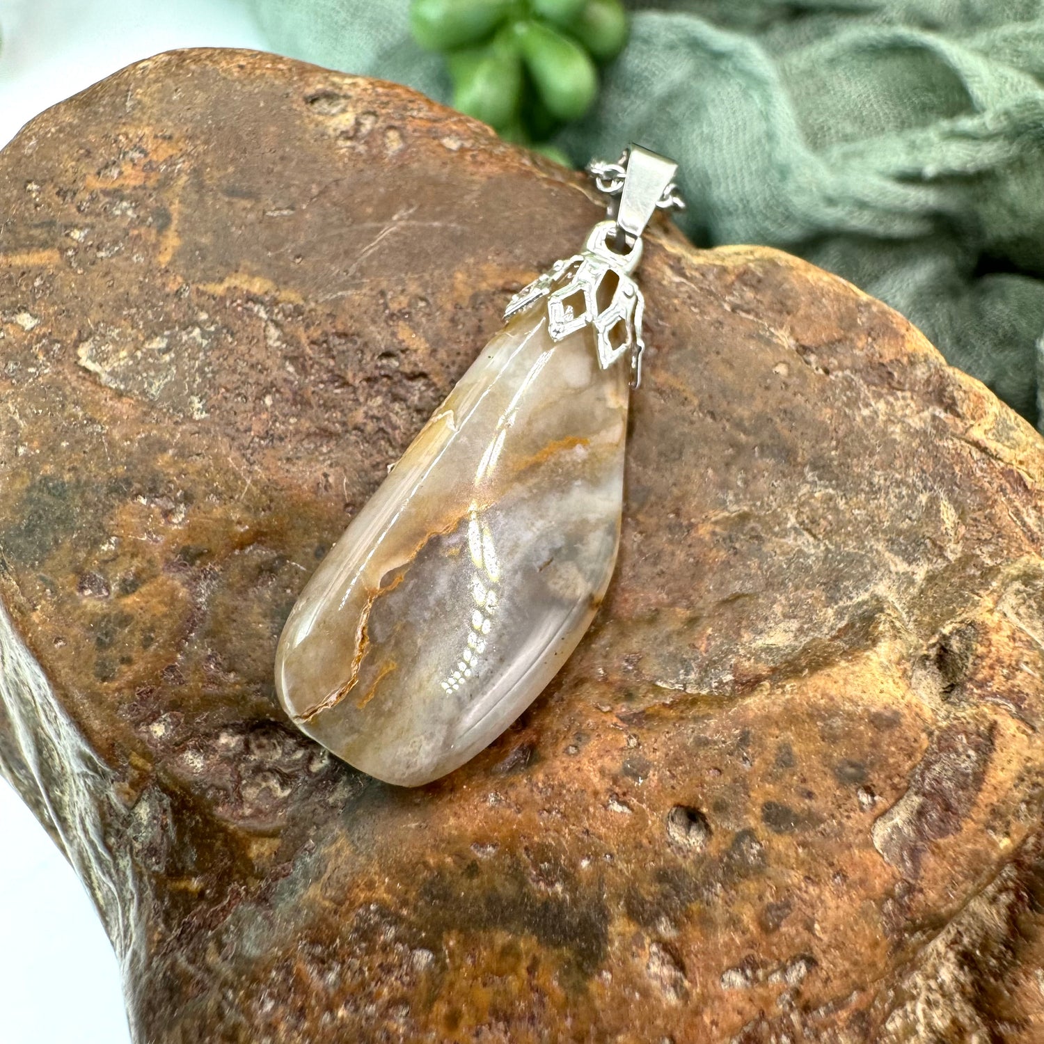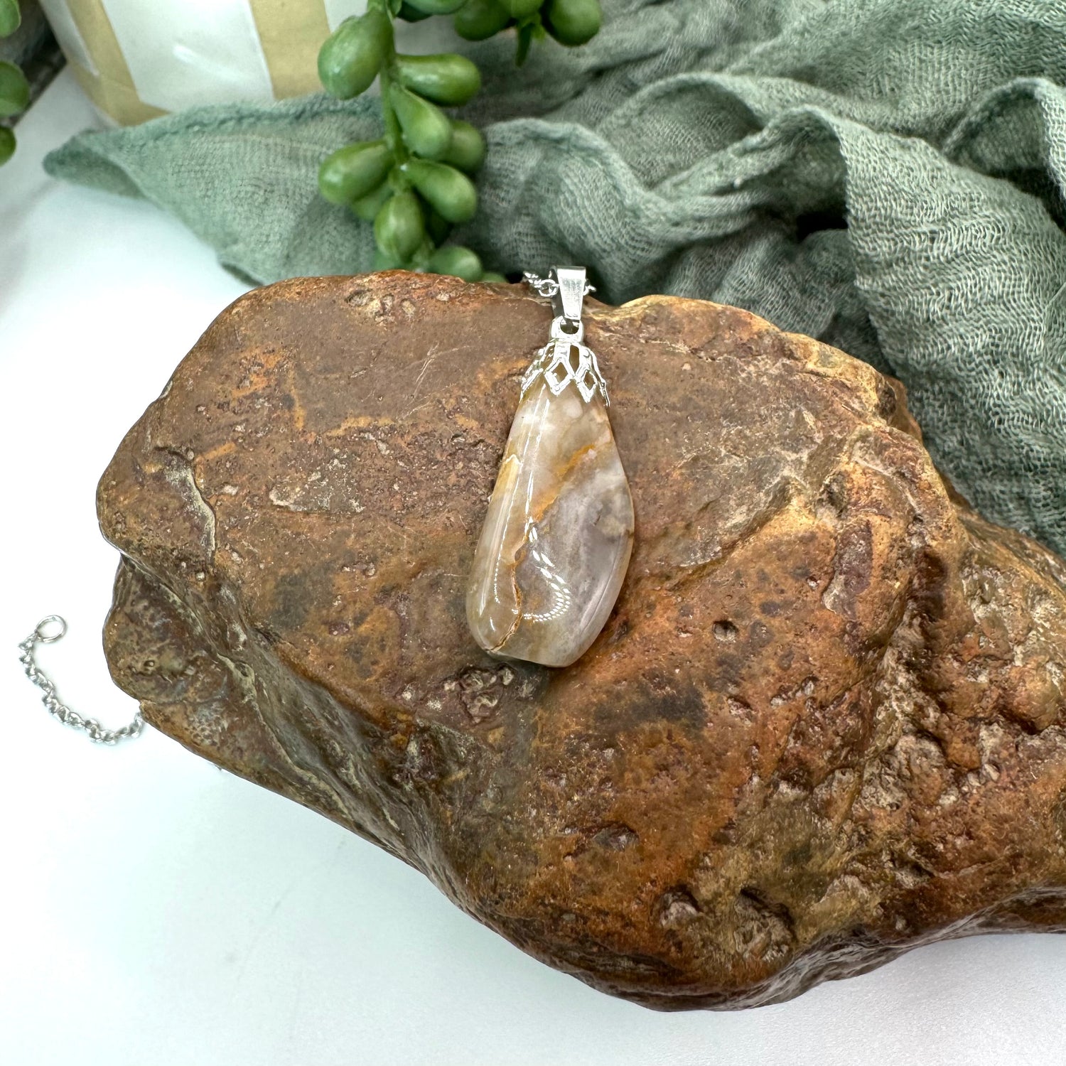 Carry a piece of the earth with you with this prairie agate necklace. Prairie agates are known for their varied patterns and distinctive color palettes: warm browns, muted yellows, soft whites, and the occasional tinge of red. The stone on this necklace was found in the plains of South Dakota and tumbled to a beautiful polish before being set on the stainless steel chain. The length can be adjusted from 18 to 20 inches. Stainless steel is hypoallergenic, highly durable, and it won't tarnish, making it a wonderful choice for everyday wear.