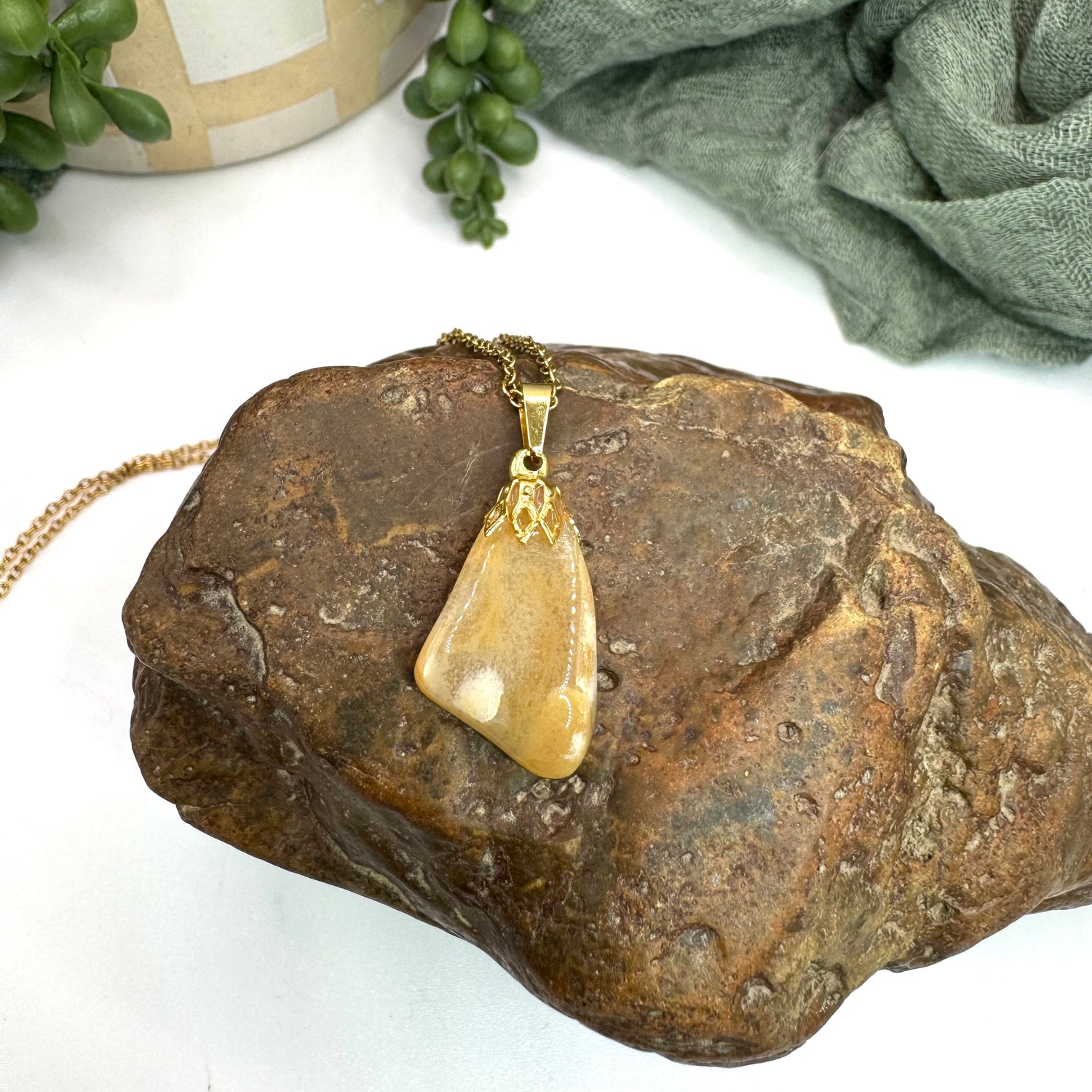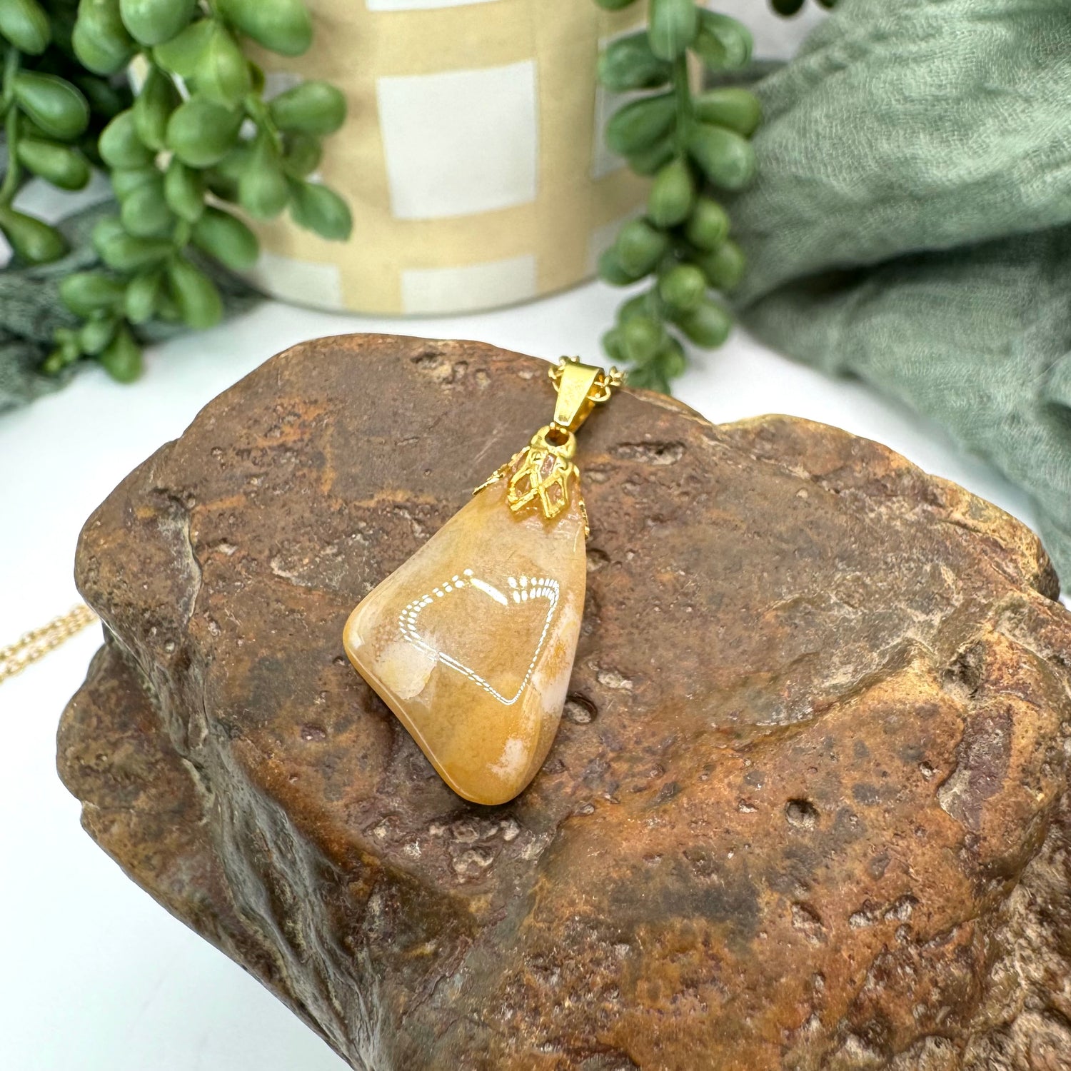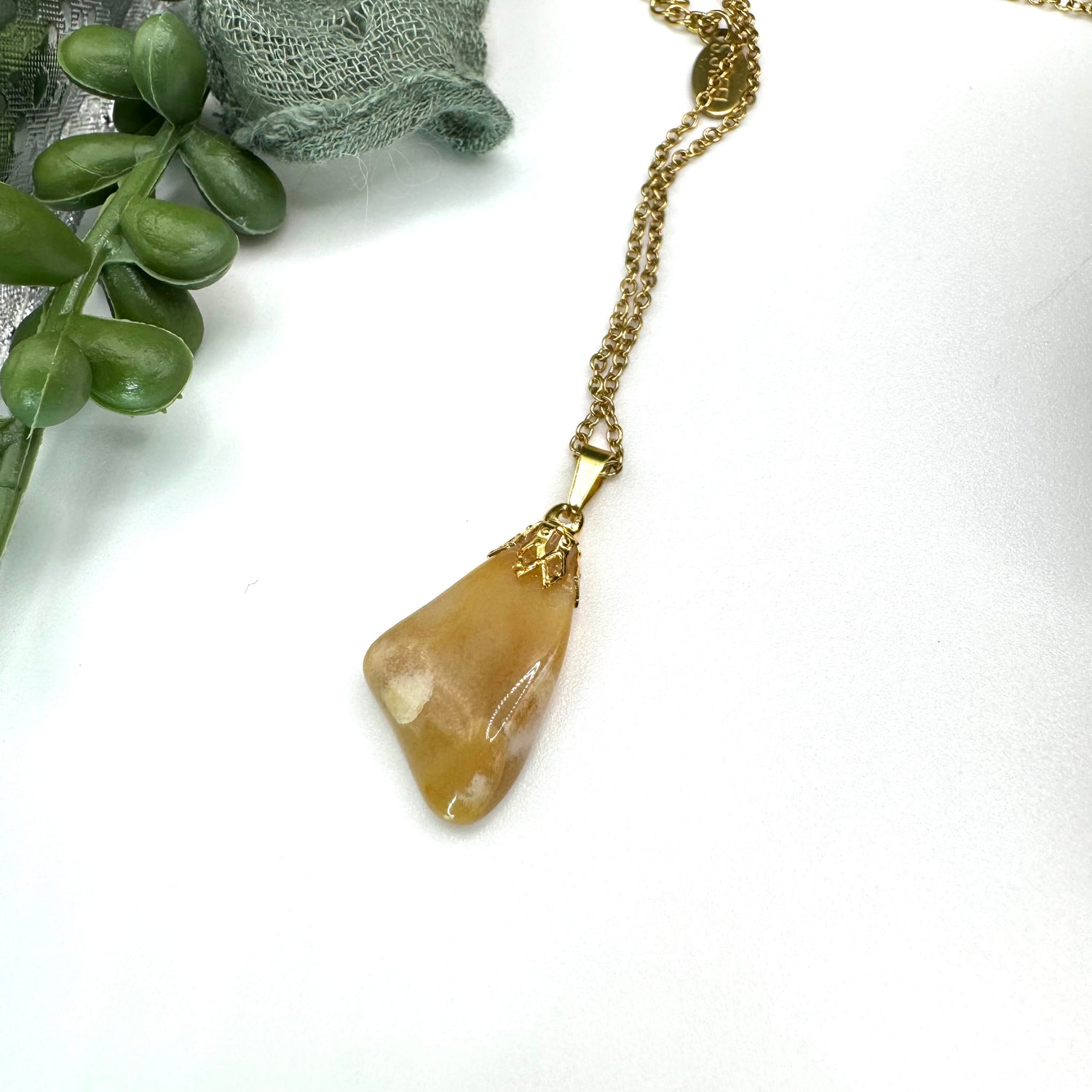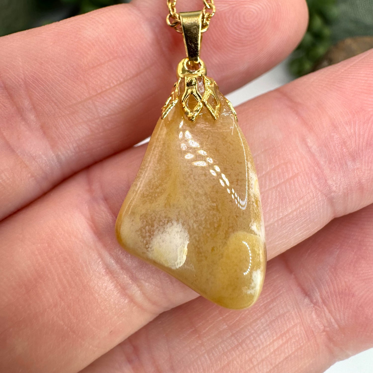 Carry a piece of the earth with you with this prairie agate necklace. Prairie agates are known for their varied patterns and distinctive color palettes: warm browns, muted yellows, soft whites, and the occasional tinge of red. The stone on this necklace was found in the plains of South Dakota and tumbled to a beautiful polish before being set on the gold-finished stainless steel chain. The length can be adjusted from 18 to 20 inches. Stainless steel is hypoallergenic, highly durable, and it won't tarnish, making it a wonderful choice for everyday wear.
