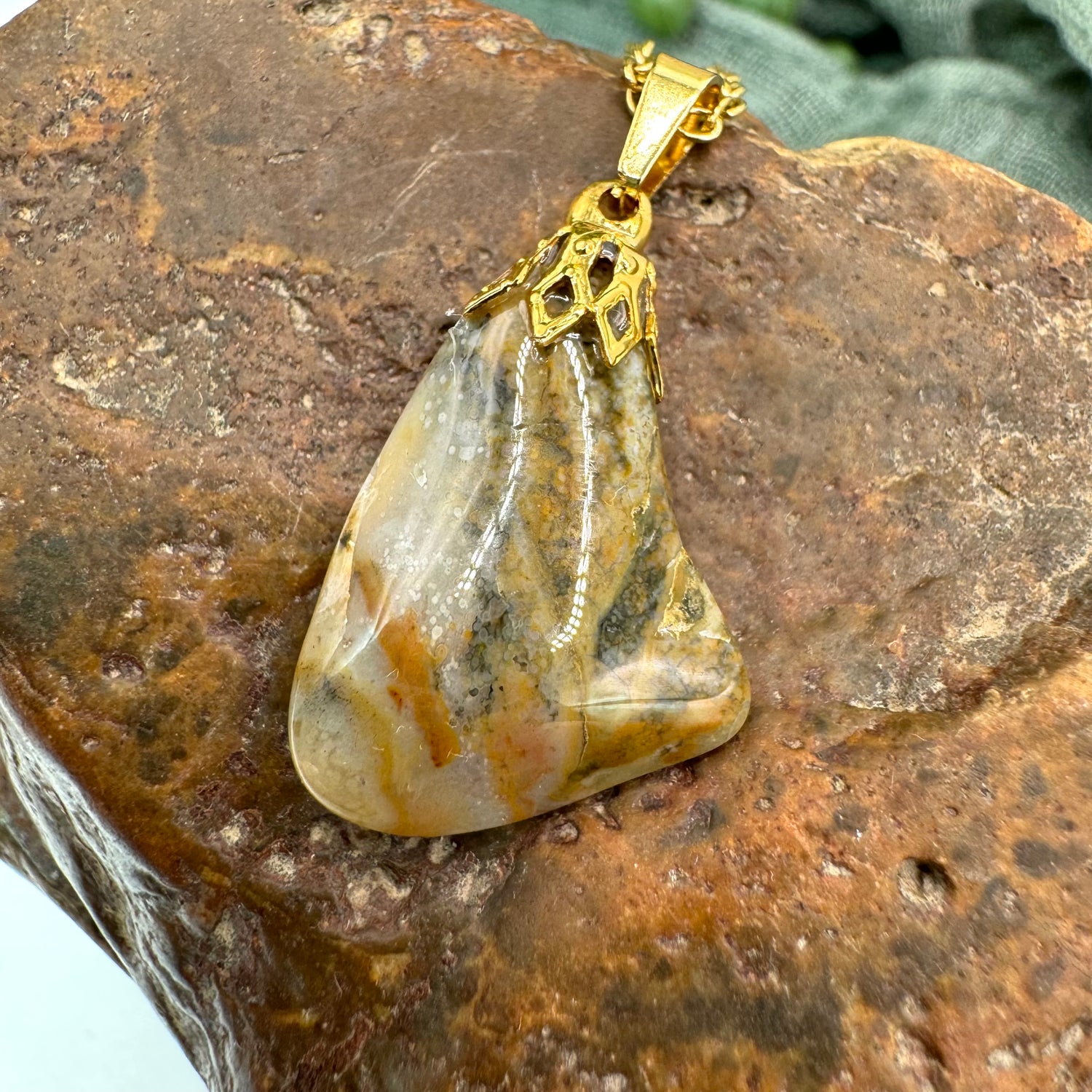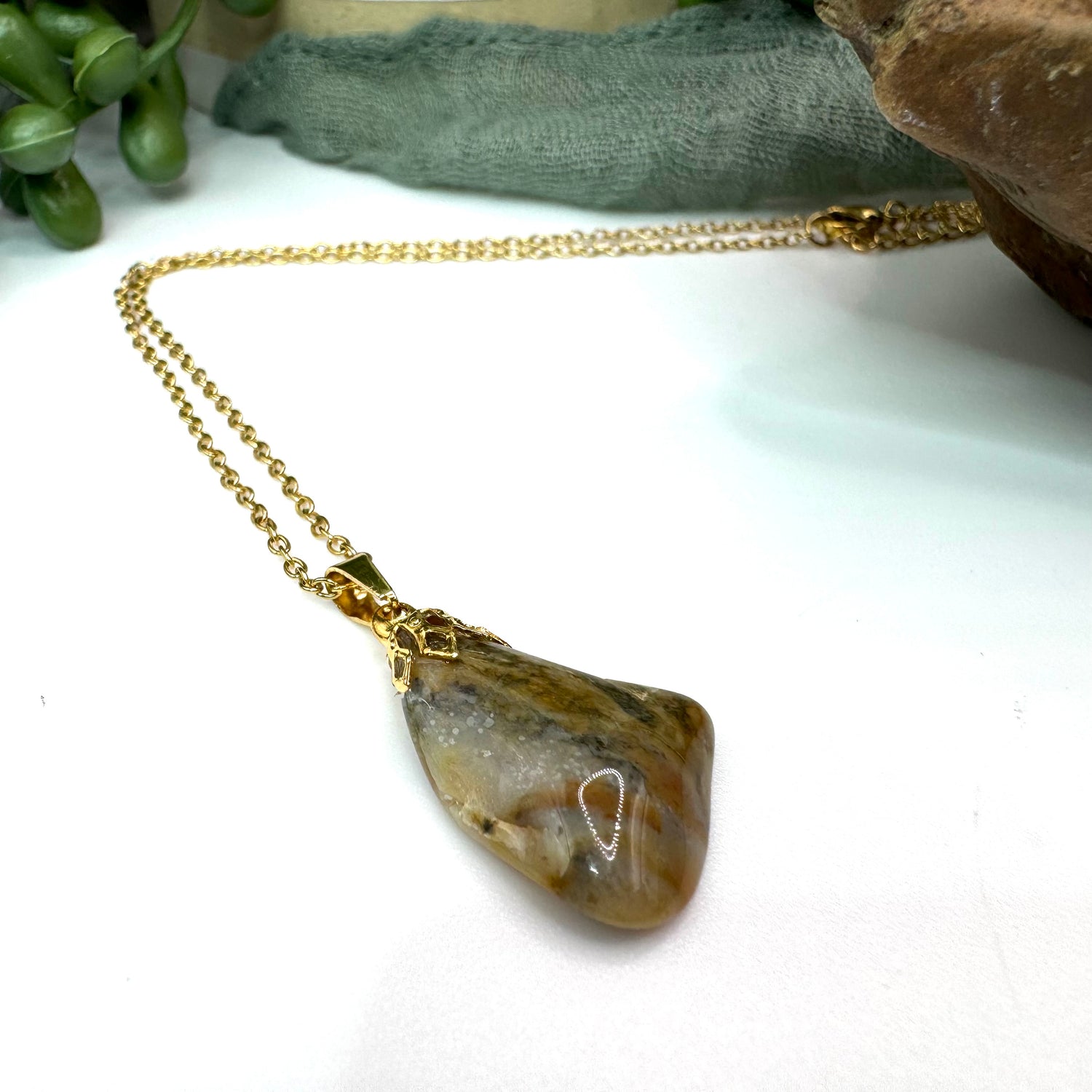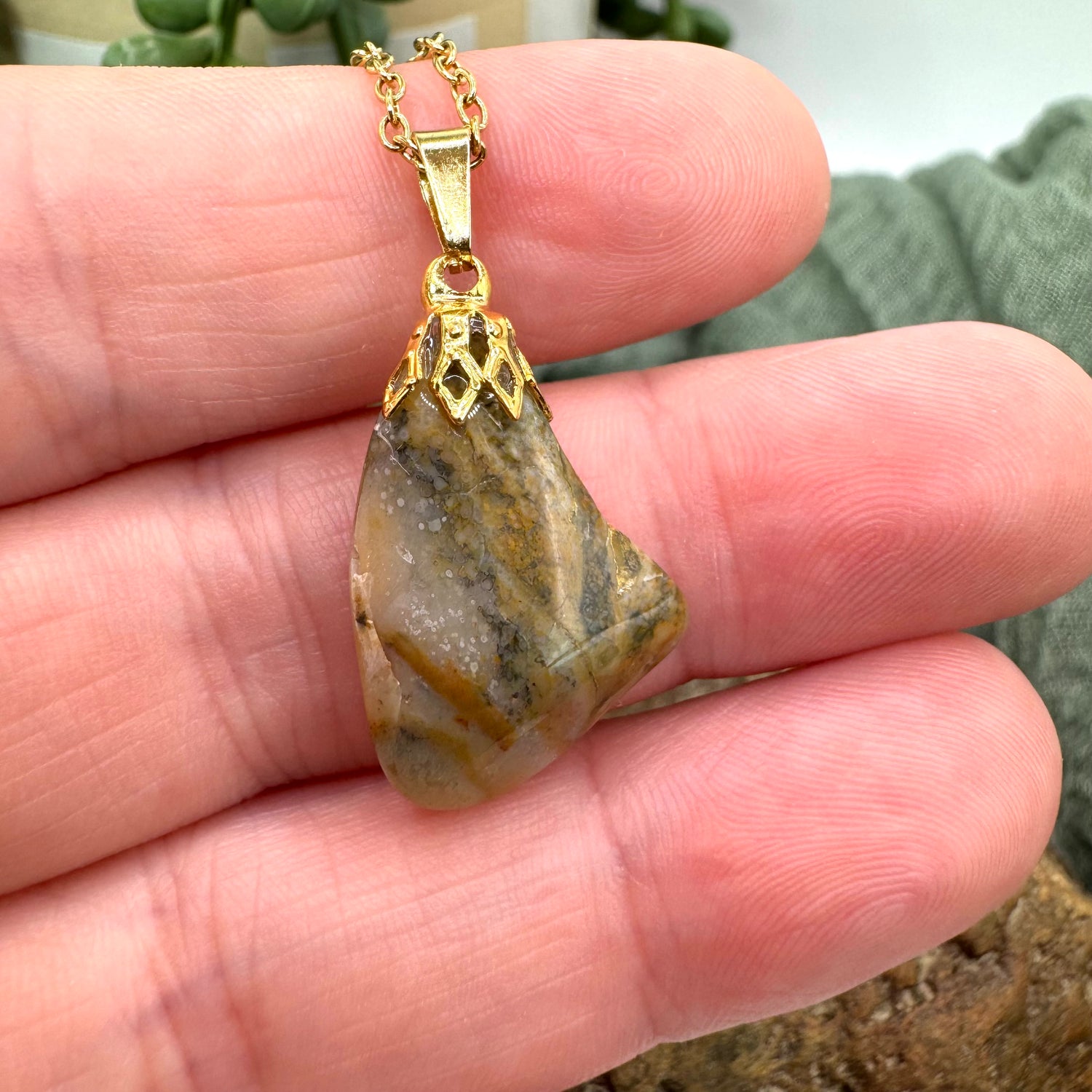 Carry a piece of the earth with you with this prairie agate necklace. Prairie agates are known for their varied patterns and distinctive color palettes: warm browns, muted yellows, soft whites, and the occasional tinge of red. The stone on this necklace was found in the plains of South Dakota and tumbled to a beautiful polish before being set on the gold-finished stainless steel chain. The length can be adjusted from 18 to 20 inches. Stainless steel is hypoallergenic, highly durable, and it won't tarnish, making it a wonderful choice for everyday wear.